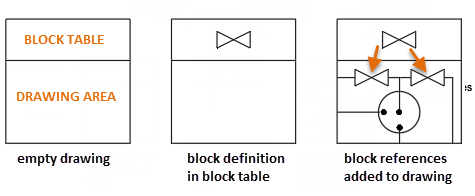 Al insertar un bloque, se inserta una referencia a bloque. La información no se copia de la definición de bloque al área de dibujo. En su lugar, se establece un vínculo entre la referencia a bloque y la definición de bloque. Por lo tanto, si se modifica la definición de bloque, todas las referencias se actualizan automáticamente.