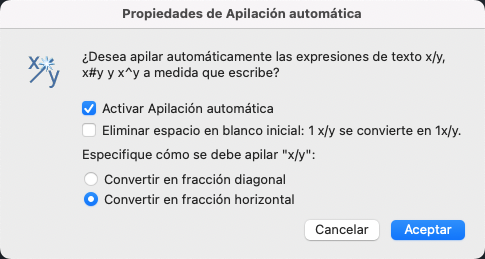 Convierte el carácter de barra oblicua en una fracción horizontal si está activada la opción Apilación automática.