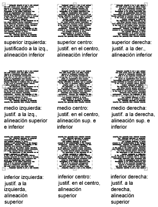 La justificación controla la alineación y el flujo del texto respecto a su punto de inserción. El texto se justifica a la derecha o a la izquierda respecto al rectángulo de contorno que define la anchura del mismo. El texto fluye desde el punto de inserción, que puede estar situado en la mitad, en la parte superior o en la parte inferior del objeto de texto resultante.