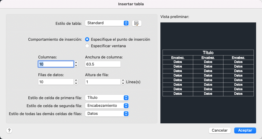 - Precise punto de inserción: después de hacer clic en Aceptar, se solicita un punto de inserción que se utiliza para la esquina superior izquierda de la tabla.