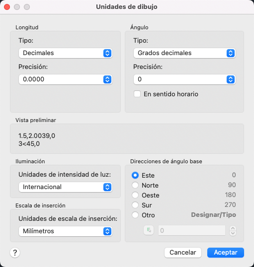 Controla el formato y la precisión mostrados de coordenadas y ángulos.