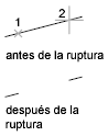 Las solicitudes que se muestran dependen del objeto seleccionado. Si se designa el objeto mediante el dispositivo señalador, el programa seleccionará dicho objeto y considerará el punto de selección como primer punto de ruptura. En la siguiente solicitud, se podrá indicar el segundo punto o modificar el primero.
