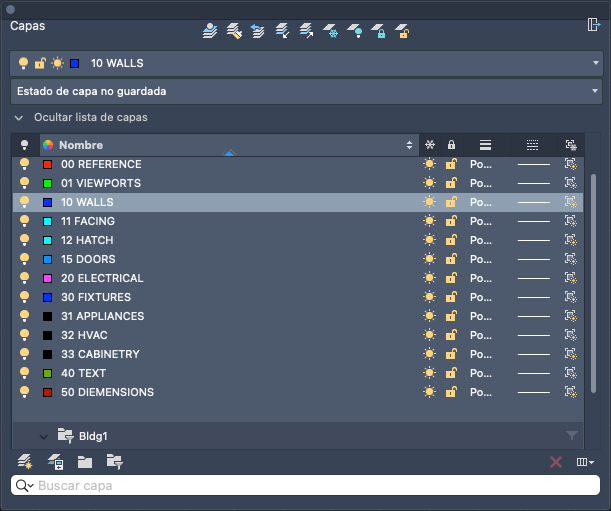 En dibujos complejos, es recomendable utilizar una nomenclatura de capas más elaborada. Por ejemplo, los nombres de capa pueden comenzar por tres dígitos seguidos de un código de nomenclatura que se ajuste a varias plantas de un edificio, números de proyecto, conjuntos de datos de propiedad y reconocimiento, etc. Este tipo de convención de nomenclatura también facilita el control del orden de las capas y limita las capas mostradas en la lista de capas.