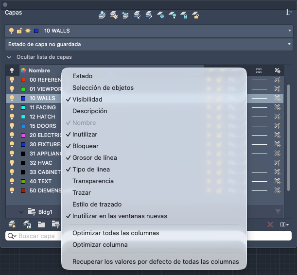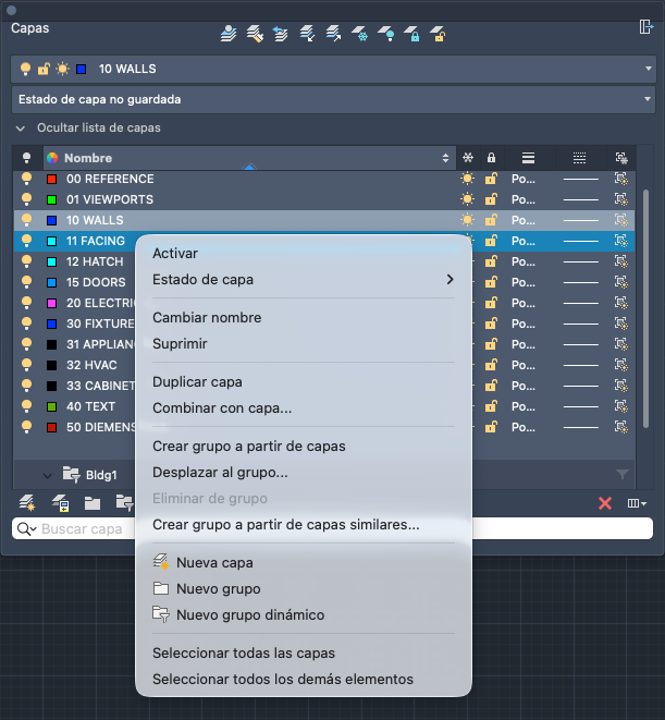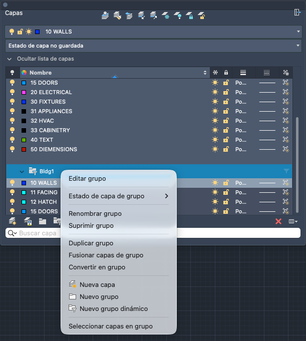 Muestra una lista de las capas existentes en el dibujo junto con sus propiedades. Puede añadir, suprimir y cambiar de nombre capas, cambiar sus propiedades y aplicar cambios en tiempo real.