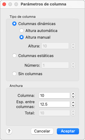 Muestra opciones para configurar las columnas, como el tipo, el número de columnas, la altura, la anchura y el tamaño del espacio entre columnas.
