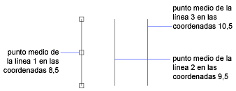 Si mantiene pulsada la tecla Ctrl mientras se seleccionan varios puntos de copia con el dispositivo señalador, el cursor gráfico se divide y se sitúa en un punto de desfase basado en los dos últimos puntos. En la siguiente ilustración, el punto medio de la línea 1 se encuentra en las coordenadas 8,5. Basándose en ese punto medio, la línea 2 se ha copiado utilizando la tecla Ctrl y el modo de pinzamiento Estirar; su punto medio se encuentra en 9,5. La tercera línea se desplaza con un desfase basado en los valores de las coordenadas 10,5.