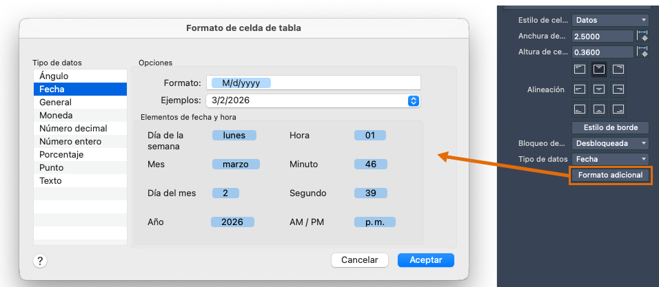 Se muestran diferentes opciones de formato en función del formato de datos seleccionado.