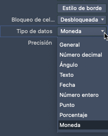 Las celdas de tabla pueden utilizar formatos de datos como moneda, números, fechas y más.