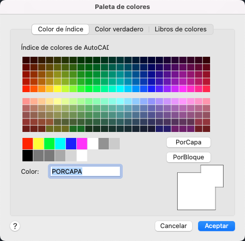 Especifica que los objetos nuevos toman el color asignado a la capa en la que se han creado. Cuando se selecciona PORCAPA, el color de la capa actual aparece en las muestras de color antigua y nueva.