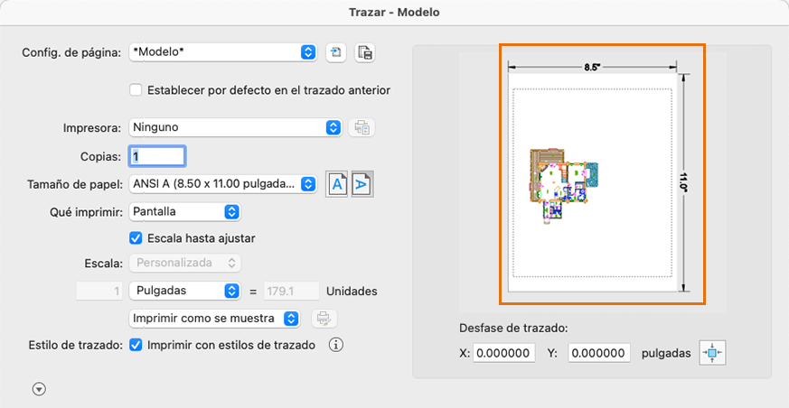 Define la escala del trazado de manera que se ajuste al tamaño de papel seleccionado y muestra el factor de escala personalizado en los cuadros Escala, Pulgada(s) = y Unidades.