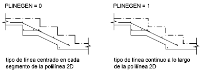 Por lo que se refiere a las polilíneas, el patrón de un tipo de línea puede ir centrado en cada segmento o continuo al cruzar los vértices a lo largo de toda la polilínea. Para establecer uno u otro, asigne un valor a la variable de sistema PLINEGEN.