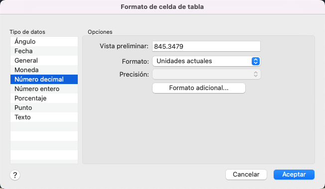 Solo para los tipos de datos Ángulo, Número decimal, Punto y Número entero, abre el cuadro de diálogo Formato adicional en el que es posible establecer opciones de formato adicionales para las celdas de una tabla.