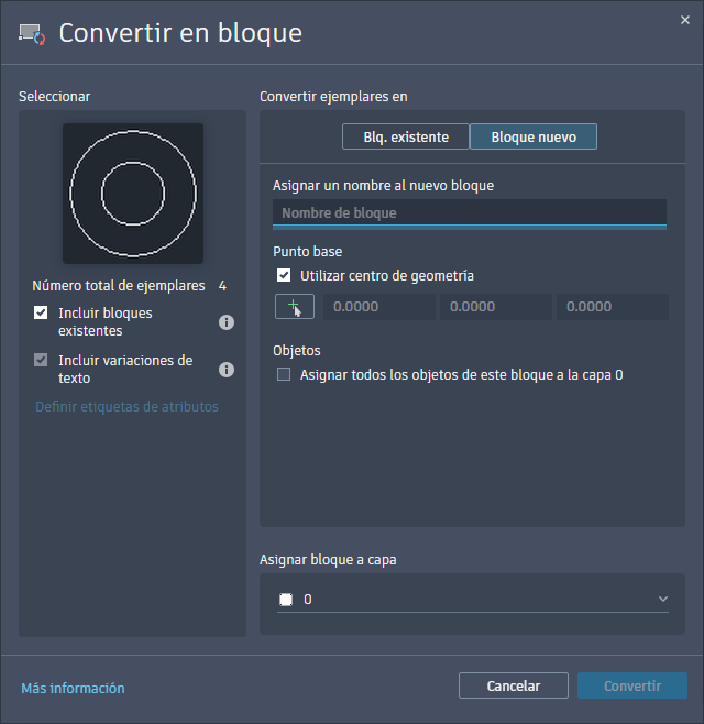 ). Cierra temporalmente el cuadro de diálogo para que pueda especificar un bloque del dibujo actual en el que desea convertir los ejemplares seleccionados.