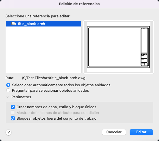 Para seleccionar la referencia que desea editar, designe un objeto de la referencia. Si selecciona un objeto que forma parte de una o más referencias anidadas, esas referencias anidadas aparecerán en el cuadro de diálogo.