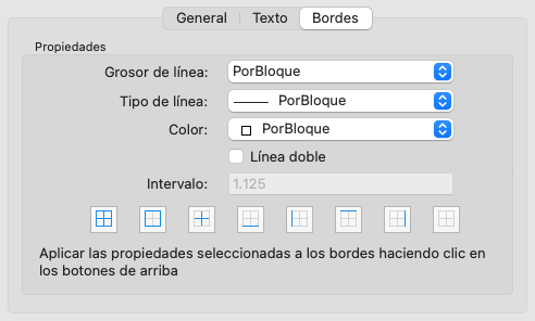 Controla el aspecto de los bordes de las celdas. Las propiedades de los bordes son el grosor de línea y el color de las líneas de la cuadrícula.