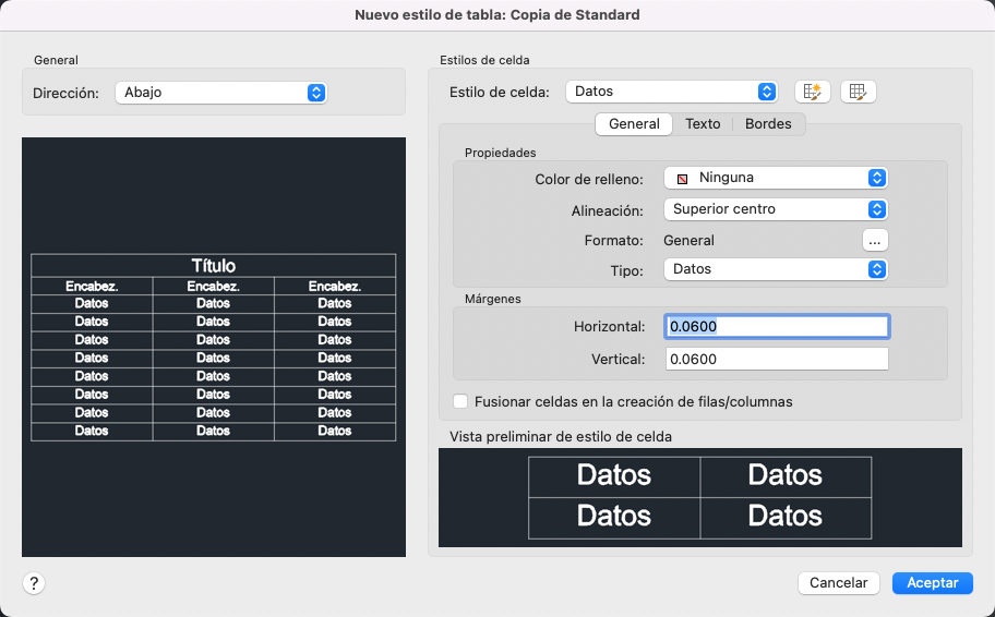 Controla el intervalo entre el borde de la celda y su contenido. Los parámetros del margen de la celda se aplican a todas las celdas de la tabla. El ajuste por defecto es 0.06 (unidades imperiales) y 1.5 (unidades métricas).