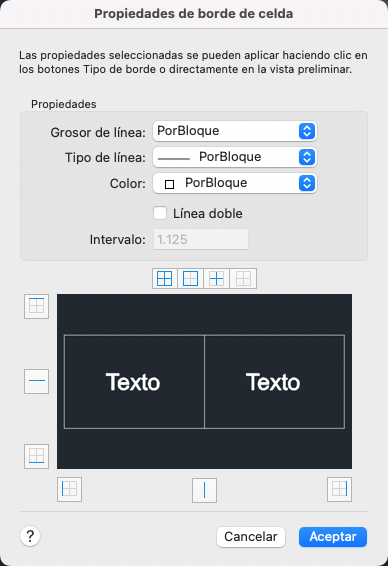 Conjuntos de herramientas: : con una celda de tabla seleccionada y la paleta Inspector de propiedades abierta, haga clic en Todo. En la sección Celda, haga clic en Estilo de borde.