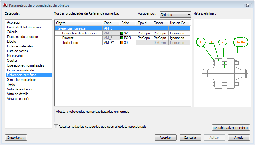En el cuadro de diálogo Parámetros de propiedades de objetos, puede predefinir las propiedades de objetos que crean los comandos de Conjunto de herramientas AutoCAD Mechanical.
