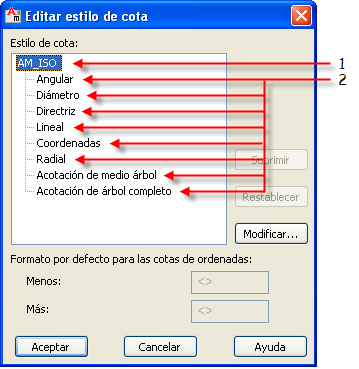 Los estilos de cota asociados a una norma de dibujo se componen de un estilo de cota base (1 en la ilustración) que define los parámetros básicos de las cotas para dicha norma, y de subestilos (2 en la ilustración) que definen explícitamente los estilos de los distintos tipos de cota. En la mayoría de los casos, los subestilos son idénticos al estilo base. En algunos casos, cuando es necesario aplicar una característica única a un tipo de cota, los parámetros por defecto para ese estilo de cota tienen al menos un parámetro distinto del estilo de cota base.