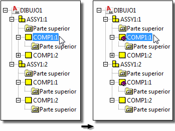 En el siguiente ejemplo se muestra un dibujo que contiene dos ejemplares del ensamblaje ASSY1: "ASSY1:1" y "ASSY1:2". COMP1 aparece dentro de ASSY1 (COMP1:2) y también fuera (COMP1:1). Al designar la pieza COMP1:2 en ASSY1:1 y convertirla en componente de referencia, también se convertirá en componente de referencia COMP1:2 en ASSY1:2. Esto se debe a que el ejemplar COMP1:2 aparece dos veces, una en ASSY1:1 y otra en ASSY1:2. Sin embargo, el ejemplar COMP1:2 no se convierte en componente de referencia.