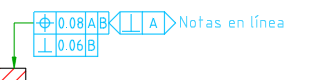 Notas en línea Especifica el texto que debe mostrarse en la misma línea que el rectángulo de tolerancia. En el área de dibujo, las notas y el rectángulo de tolerancia se desplazan a la vez como una sola entidad. Esta opción solo está disponible en las revisiones ISO 1101:2017(E) y ANSI/ASME Y14.5-2018 R(2024).