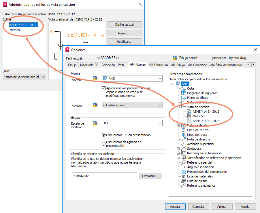 Los parámetros que controlan el aspecto de los objetos del Conjunto de herramientas AutoCAD Mechanical se guardan en una colección de parámetros que se conoce como "norma de dibujo". Los estilos de vista en sección se guardan con la norma de dibujo y se tratan como revisiones de la norma de dibujo.