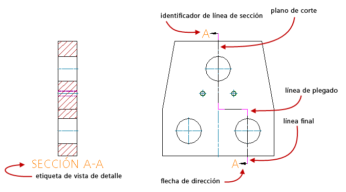 Cuando el tamaño del texto para las etiquetas de líneas de sección y vistas en sección es “Por NombreNormaDibujoActual”, éstas adquieren automáticamente una altura del texto que es un tamaño mayor que el parámetro principal de altura de la base. Las etiquetas de líneas de sección y vistas en sección resultan mayores que el texto de cotas, notas y símbolos. Si modifica los parámetros principales, el tamaño del texto para las etiquetas de líneas de sección y vistas en sección se actualiza automáticamente.