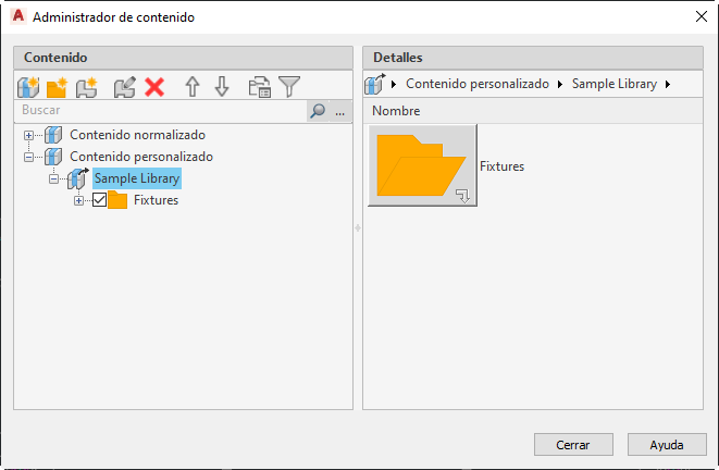 El comando AMCONTENTMANAGER muestra el cuadro de diálogo Administrador de contenido, que contiene numerosas herramientas para crear y administrar bibliotecas de contenido.