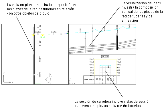Un objeto de red de tuberías administra una colección de objetos de tubería y de estructura asociados entre sí para representar un sistema de tuberías. Normalmente, las tuberías y estructuras están conectadas entre sí, de manera que forman un colector único o una red de tuberías. Los objetos de tubería y estructura de una red de tuberías se pueden asociar con una alineación de referencia o con una superficie, que le proporciona datos de desfase de P.K. y de elevación. Cada pieza de una red de tuberías puede hacer referencia a cualquier superficie o alineación determinada en el dibujo.