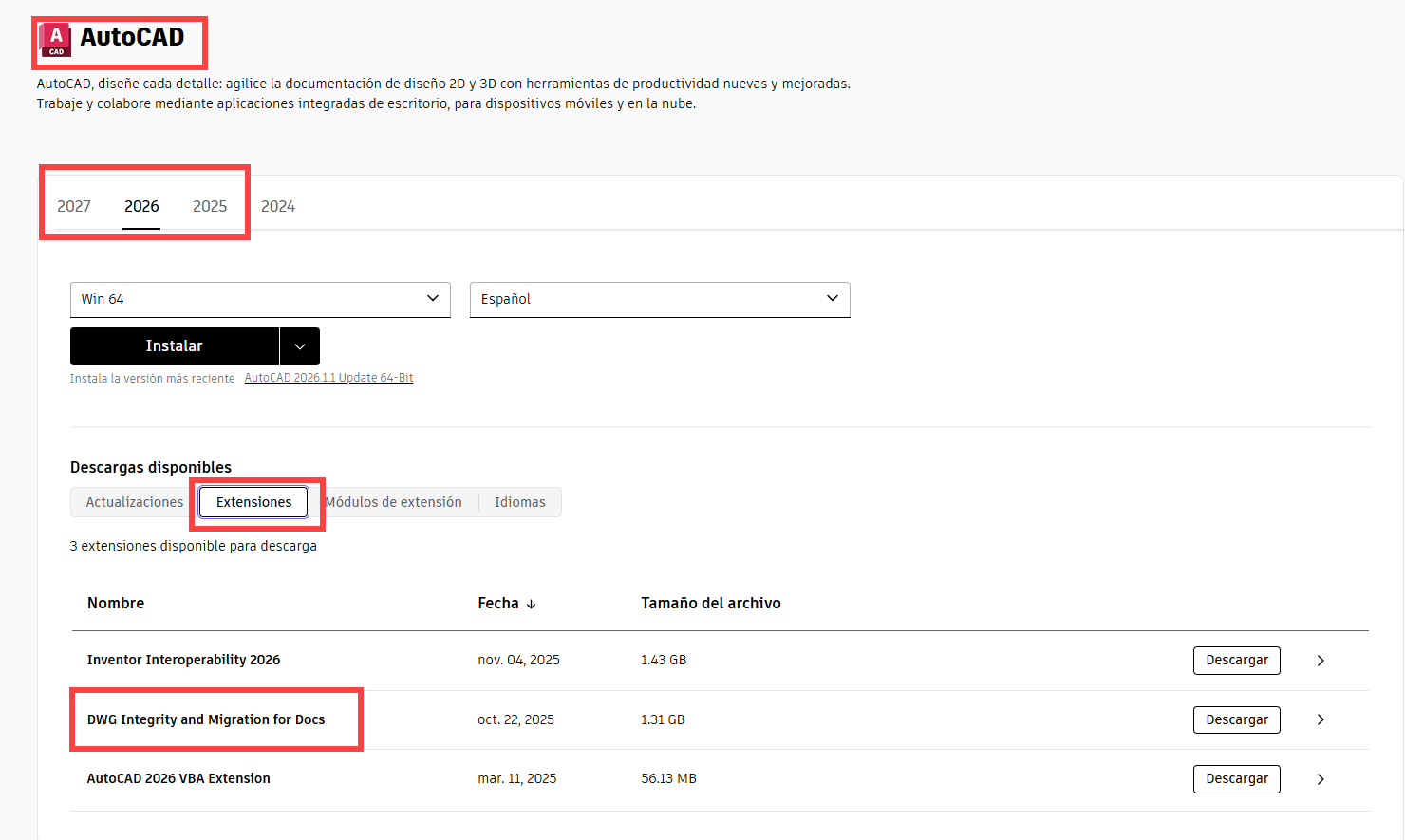 - La página Extensiones de AutoCAD.