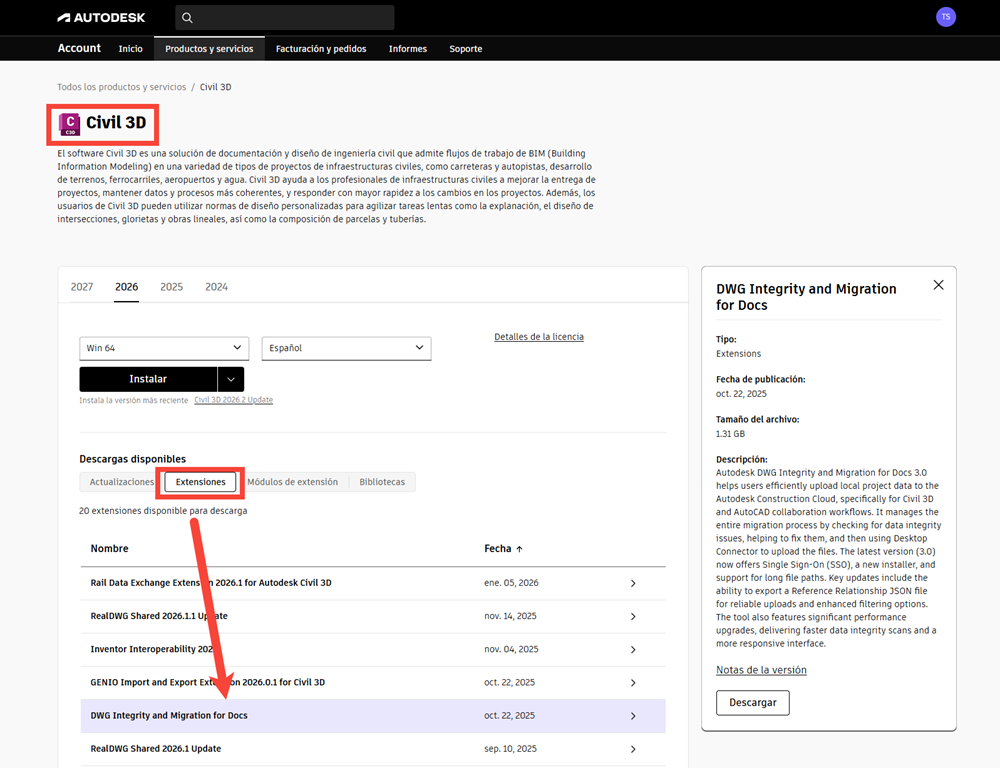 - El instalador se encuentra en la página Extensiones de Civil 3D.