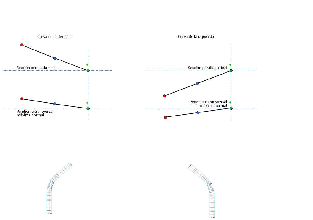 Para obtener más información sobre los diagramas de peralte, consulte Acerca de los métodos de giro del eje de rotación de peralte.
