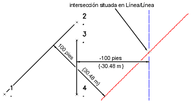 Se ubica una intersección entre una línea dibujada entre los puntos 1 y 2 con un desfase de 100 pies a la derecha y una línea dibujada entre los puntos 3 y 4 con un desfase de 100 pies a la izquierda.