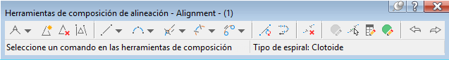 El nombre de la alineación seleccionada actualmente aparece en la parte superior de la barra de herramientas. Al hacer clic en un icono, aparece el comando actual en la parte inferior de la barra de herramientas. La barra de herramientas permanece abierta al editar mediante pinzamientos la alineación o al introducir otro comando. La barra de herramientas se cierra al suprimir la alineación actualmente seleccionada o al hacer clic en el botón X en la esquina superior derecha de la barra de herramientas.