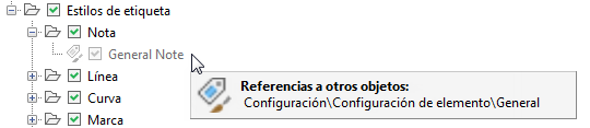 En este ejemplo, la Configuración general de elemento hace referencia al estilo Nota general, por lo que la casilla de verificación de Nota general no se puede desactivar.