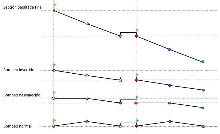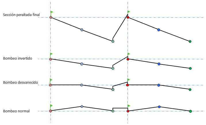 En la ilustración siguiente se muestra una carretera dividida como el tipo de obra lineal y una forma de sección transversal con bombeo en cada lado. La carretera experimenta un desvanecimiento del bombeo adverso durante el peralte: