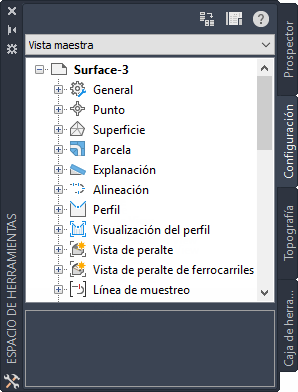 La ventana Espacio de herramientas puede mostrar hasta cuatro fichas: Prospector, Configuración, Topografía y Caja de herramientas. La ventana Panorámica muestra fichas guardadas en caso de que en la ventana haya más de una vista activa.