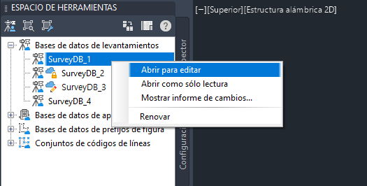 - En el Espacio de herramientas, en la ficha Topografía, expanda la colección Bases de datos de levantamientos.