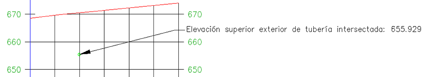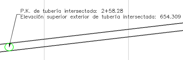 Si se desplaza la tubería de presión intersectada a otro P.K. a lo largo de la alineación, las etiquetas se actualizarán con la nueva información de elevación y P.K.