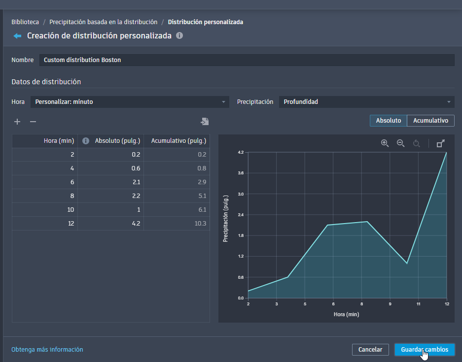La creación de distribuciones personalizadas define la distribución de precipitaciones (patrón temporal) para los eventos de precipitaciones basados en la distribución.