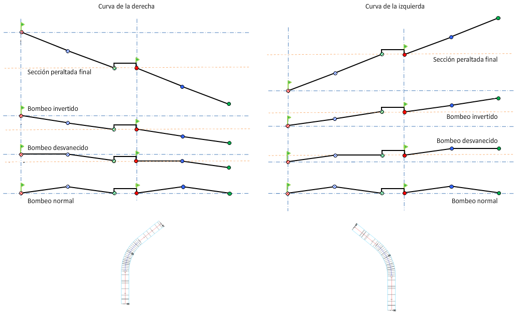 Para obtener más información sobre los diagramas de peralte, consulte Acerca de los métodos de giro del eje de rotación de peralte.