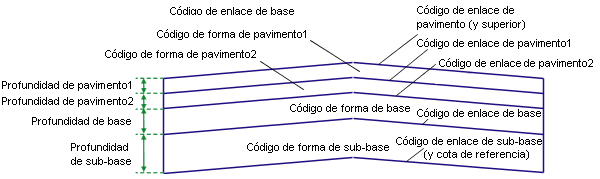 Los códigos de vínculo estándar en orden descendente son Pave, Pave1, Pave2, Base y Subbase. El código Top también se asigna a los vínculos de rasante, de modo que coincidan con los vínculos Pavimento de secciones pavimentadas. El código Datum también se asigna a la parte inferior de la sub-base. Los códigos de forma de las áreas de material en orden descendente son Pave1, Pave2, Base y Subbase.