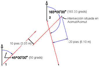 | acimut 1, acimut 2 | Acimutes para las líneas a partir de los puntos existentes (punto 1 y punto 2). Los acimutes establecen una orientación para cada vector y se expresan en las unidades de ángulo actuales. |