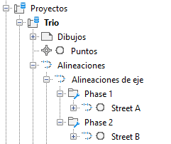 Puede organizar los objetos de proyecto en subcarpetas utilizando Autodesk Vault. Las subcarpetas se muestran en el prospector si contienen un objeto de proyecto. En la siguiente ilustración se muestran dos subcarpetas de alineaciones de proyecto en el prospector que existen en la carpeta Alineaciones de eje.