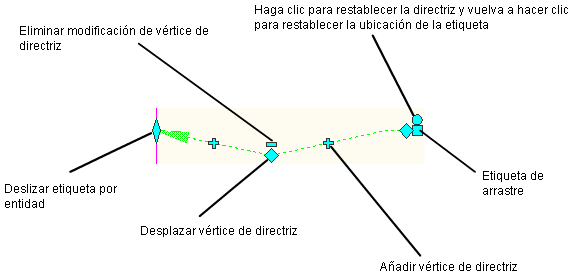 pinzamientos en las líneas de directriz resultantes. Utilice estos pinzamiento para crear vértices adicionales. Nota: Si el tipo de directriz en las opciones de etiqueta arrastrada del estilo de etiqueta está definido como spline, se realiza un ajuste de spline de AutoCAD a través de los puntos de vértice.
