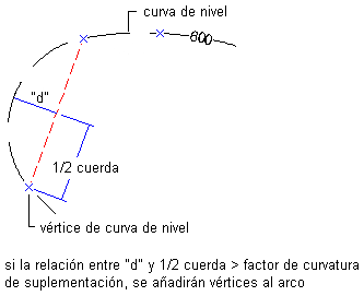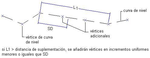 La distancia de suplementación es la distancia máxima entre dos vértices. Si la distancia entre los vértices de una curva de nivel es mayor que el factor de suplementación, se añaden puntos a lo largo de la curva de nivel a intervalos iguales, los cuales son inferiores o iguales a la distancia de suplementación. Cuanto menor sea la distancia, mayor será el número de puntos suplementarios.