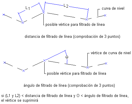 El filtro de línea reduce el número de puntos generados en las curvas de nivel. Los factores de filtro de línea ignoran dos vértices que están más próximos que el factor de distancia y los vértices con una curvatura inferior al factor de ángulo. Con una distancia y un ángulo de curvatura mayores se simplifica un mayor número de puntos. El factor de distancia se mide en unidades lineales y el factor de ángulo en unidades angulares. Los factores de filtro de línea deben ser inferiores a los factores de suplementación.