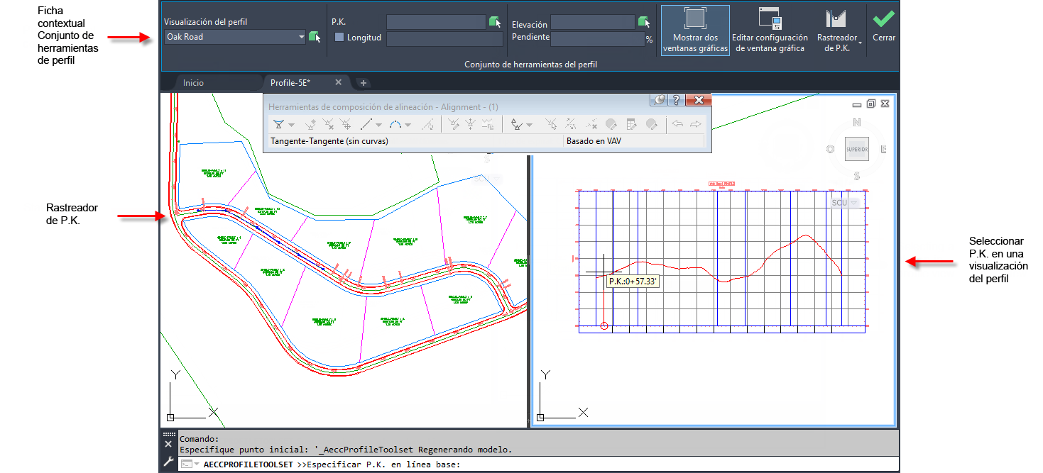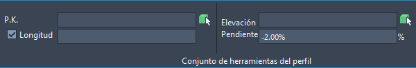 Utilice el comando transparente Conjunto de herramientas de perfil para especificar valores de P.K., elevación, rasante o longitud al crear y editar perfiles.
