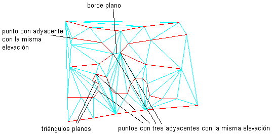 La condición de varias curvas de nivel, que sucede cuando un punto tiene más de dos puntos adyacentes con la misma elevación, suele producirse en un área plana de la superficie. Si se detecta esta condición, se puede usar la operación Minimizar áreas planas para corregir el problema. Si el punto está en el borde de la superficie, el área plana puede ser simplemente un artefacto no deseado del proceso de triangulación. Puede eliminar estos triángulos no deseados con la operación Suprimir línea o añadiendo un contorno oculto.