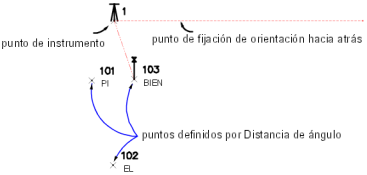 Este ejemplo crea el punto 103, que se ubica girando un ángulo horizontal de 80°20'40" hacia la derecha a una distancia de 100 unidades desde el punto de instrumento con la descripción BIEN. Debido a que no se ha indicado ningún método de diferencia vertical, la elevación es <Nulo>.